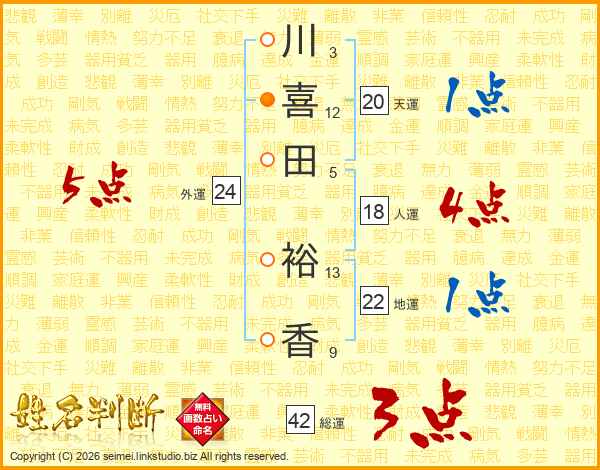 川(3画)喜(12画)田(5画) 裕(13画)香(9画)