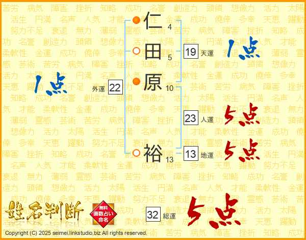 あなたの人生を表す1番重要な運勢です。生涯を通じて影響する総合運となり、主に50歳以降の晩年期に影響を及ぼします。苗字と名前の合計画数。