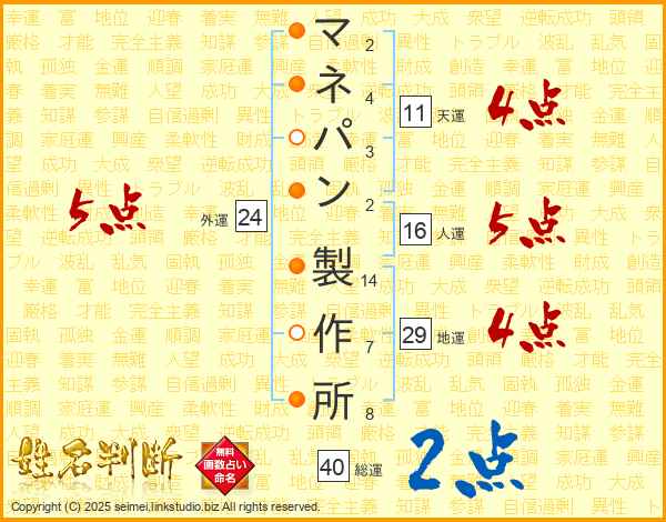 マ(2画)ネ(4画)パ(3画)ン(2画) 製(14画)作(7画)所(8画)