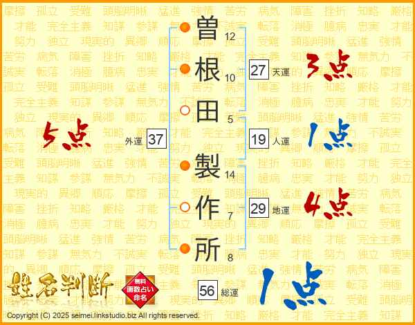 曽(12画)根(10画)田(5画) 製(14画)作(7画)所(8画)