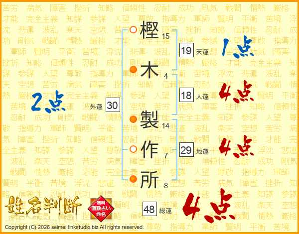 樫(15画)木(4画) 製(14画)作(7画)所(8画)