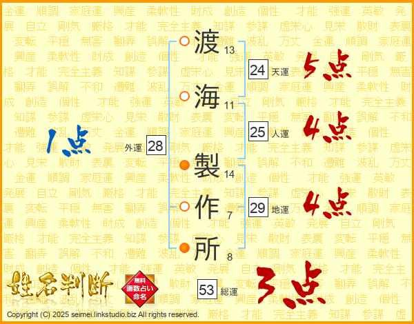 渡(13画)海(11画) 製(14画)作(7画)所(8画)