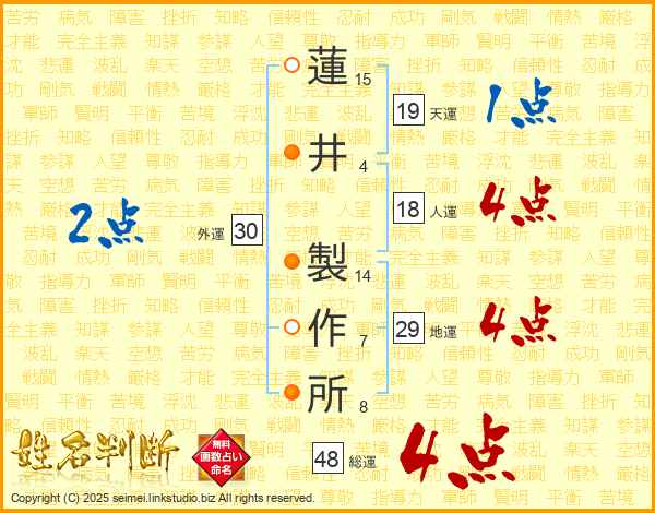 蓮(15画)井(4画) 製(14画)作(7画)所(8画)