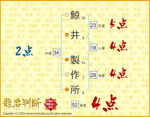 鯨(19画)井(4画) 製(14画)作(7画)所(8画)