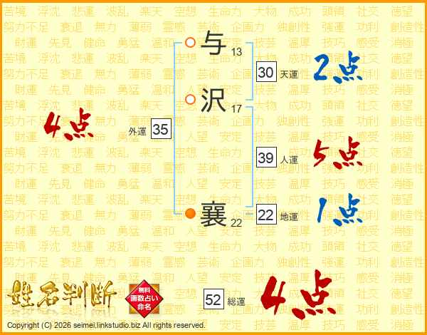 与沢襄さんの総運は52画の4点!