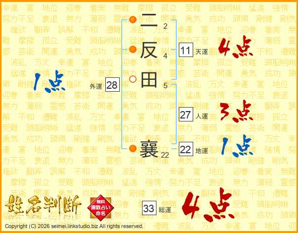 生活面を象徴する運勢です。外部から受ける影響力を表し、結婚運、家庭運や職場、環境への順応性を表します。総運から人運を引いた画数。姓や名が1文字の場合を除く。