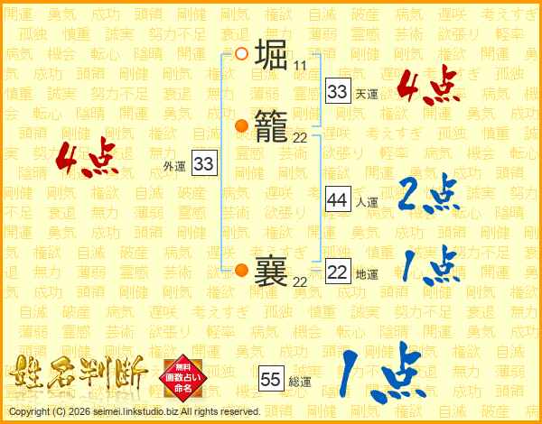 生活面を象徴する運勢です。外部から受ける影響力を表し、結婚運、家庭運や職場、環境への順応性を表します。総運から人運を引いた画数。姓や名が1文字の場合を除く。