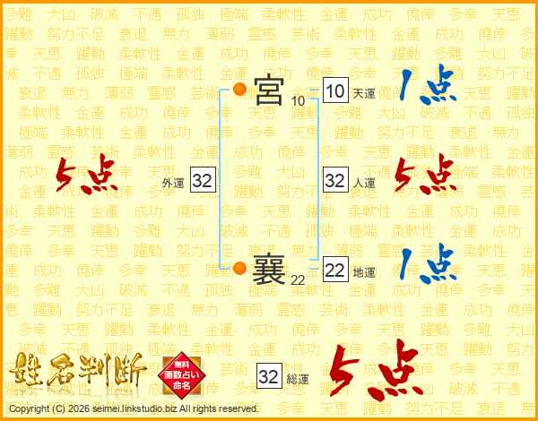 生活面を象徴する運勢です。外部から受ける影響力を表し、結婚運、家庭運や職場、環境への順応性を表します。総運から人運を引いた画数。姓や名が1文字の場合を除く。