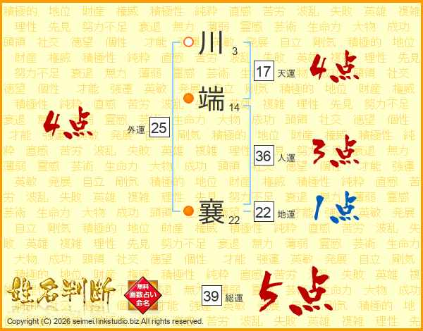 生活面を象徴する運勢です。外部から受ける影響力を表し、結婚運、家庭運や職場、環境への順応性を表します。総運から人運を引いた画数。姓や名が1文字の場合を除く。