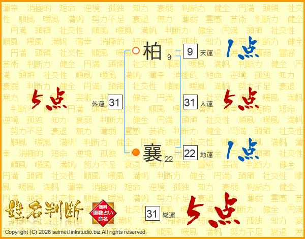 生活面を象徴する運勢です。外部から受ける影響力を表し、結婚運、家庭運や職場、環境への順応性を表します。総運から人運を引いた画数。姓や名が1文字の場合を除く。