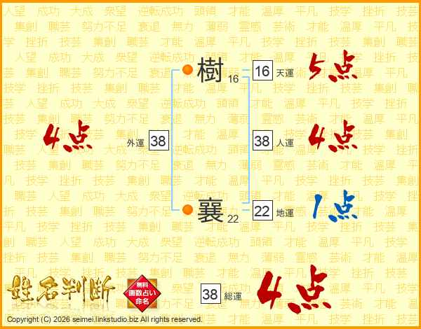 生活面を象徴する運勢です。外部から受ける影響力を表し、結婚運、家庭運や職場、環境への順応性を表します。総運から人運を引いた画数。姓や名が1文字の場合を除く。