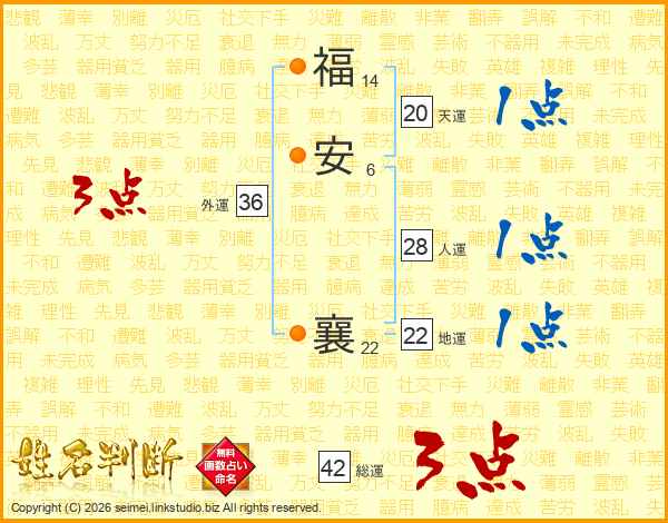 生活面を象徴する運勢です。外部から受ける影響力を表し、結婚運、家庭運や職場、環境への順応性を表します。総運から人運を引いた画数。姓や名が1文字の場合を除く。