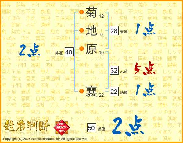 生活面を象徴する運勢です。外部から受ける影響力を表し、結婚運、家庭運や職場、環境への順応性を表します。総運から人運を引いた画数。姓や名が1文字の場合を除く。