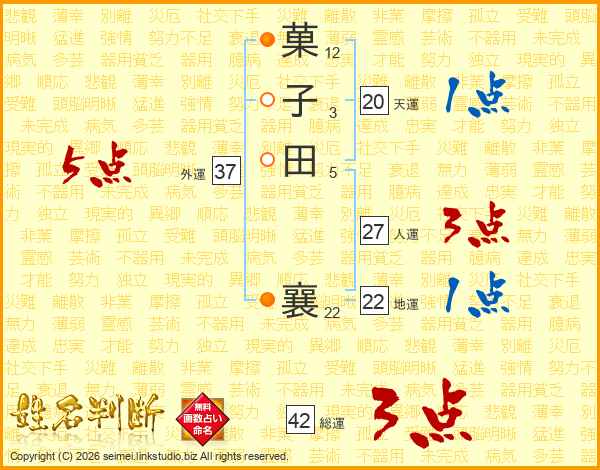 生活面を象徴する運勢です。外部から受ける影響力を表し、結婚運、家庭運や職場、環境への順応性を表します。総運から人運を引いた画数。姓や名が1文字の場合を除く。