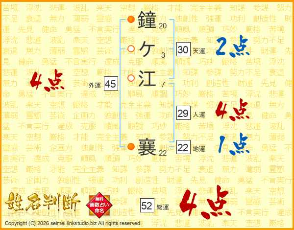 鐘ケ江襄さんの総運は52画の4点!