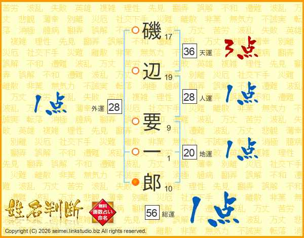 磯(17画)辺(19画) 要(9画)一(1画)郎(10画)