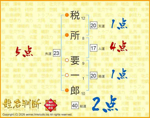 税(12画)所(8画) 要(9画)一(1画)郎(10画)