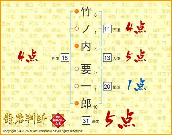 竹(6画)ノ(1画)内(4画) 要(9画)一(1画)郎(10画)