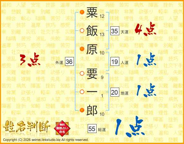 粟(12画)飯(13画)原(10画) 要(9画)一(1画)郎(10画)