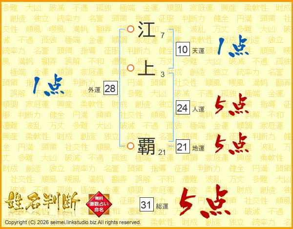 江上覇さんの総運は31画の5点!