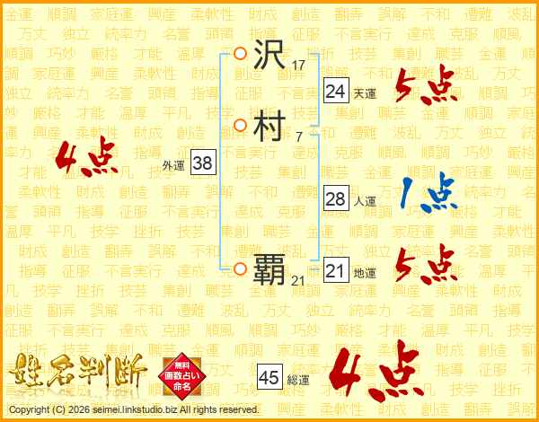 沢(17画)村(7画) 覇(21画)