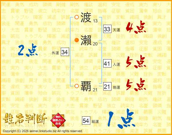 生活面を象徴する運勢です。外部から受ける影響力を表し、結婚運、家庭運や職場、環境への順応性を表します。総運から人運を引いた画数。姓や名が1文字の場合を除く。