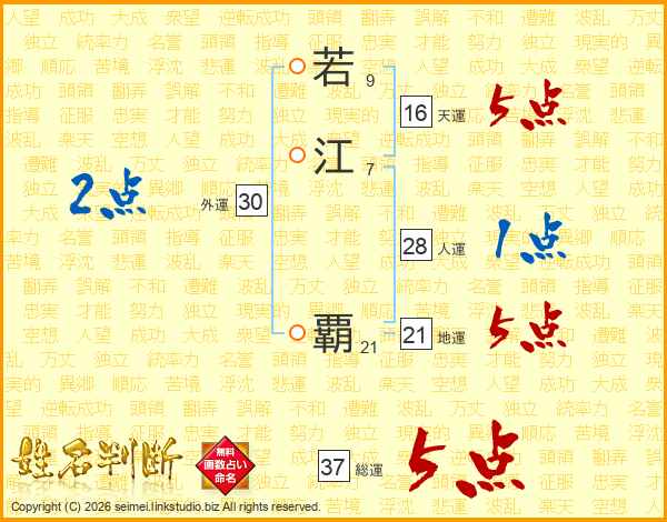 あなたの人生を表す1番重要な運勢です。生涯を通じて影響する総合運となり、主に50歳以降の晩年期に影響を及ぼします。苗字と名前の合計画数。