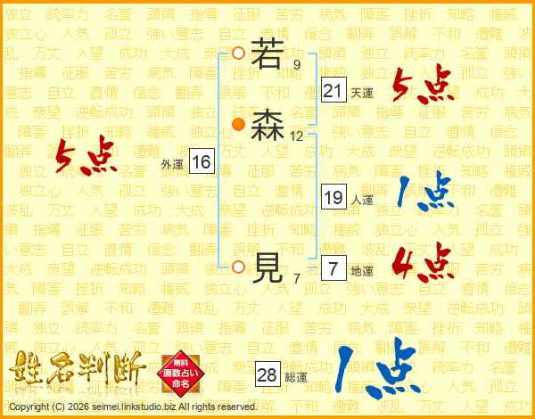 あなたの人生を表す1番重要な運勢です。生涯を通じて影響する総合運となり、主に50歳以降の晩年期に影響を及ぼします。苗字と名前の合計画数。