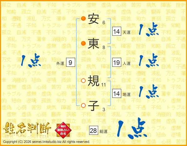 安(6画)東(8画) 規(11画)子(3画)