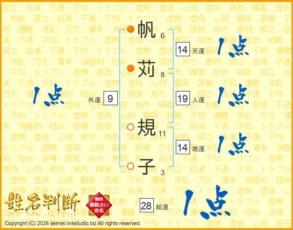 生活面を象徴する運勢です。外部から受ける影響力を表し、結婚運、家庭運や職場、環境への順応性を表します。総運から人運を引いた画数。姓や名が1文字の場合を除く。