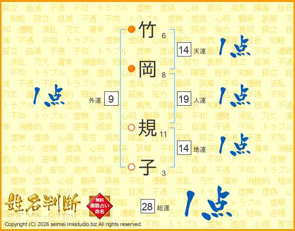 生活面を象徴する運勢です。外部から受ける影響力を表し、結婚運、家庭運や職場、環境への順応性を表します。総運から人運を引いた画数。姓や名が1文字の場合を除く。