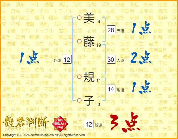 生活面を象徴する運勢です。外部から受ける影響力を表し、結婚運、家庭運や職場、環境への順応性を表します。総運から人運を引いた画数。姓や名が1文字の場合を除く。