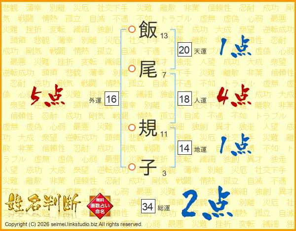 生活面を象徴する運勢です。外部から受ける影響力を表し、結婚運、家庭運や職場、環境への順応性を表します。総運から人運を引いた画数。姓や名が1文字の場合を除く。