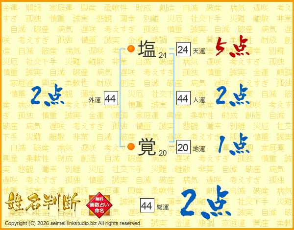 生活面を象徴する運勢です。外部から受ける影響力を表し、結婚運、家庭運や職場、環境への順応性を表します。総運から人運を引いた画数。姓や名が1文字の場合を除く。