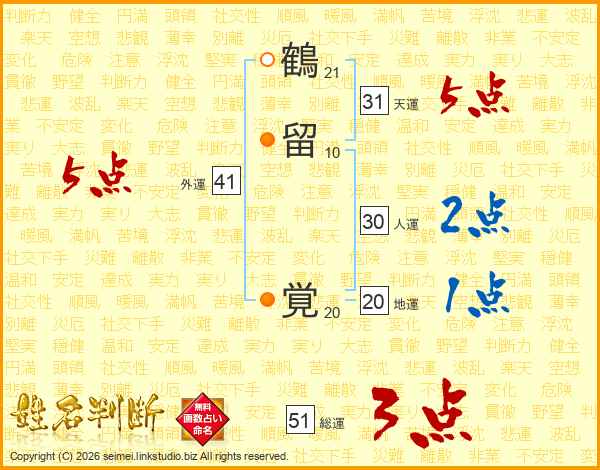 あなたの人生を表す1番重要な運勢です。生涯を通じて影響する総合運となり、主に50歳以降の晩年期に影響を及ぼします。苗字と名前の合計画数。