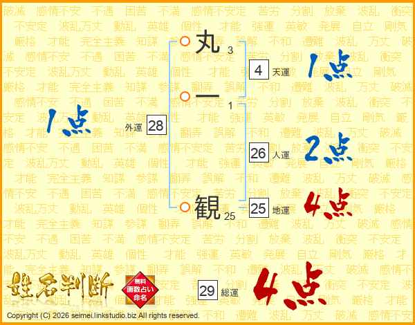 生活面を象徴する運勢です。外部から受ける影響力を表し、結婚運、家庭運や職場、環境への順応性を表します。総運から人運を引いた画数。姓や名が1文字の場合を除く。