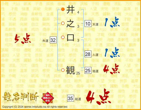 生活面を象徴する運勢です。外部から受ける影響力を表し、結婚運、家庭運や職場、環境への順応性を表します。総運から人運を引いた画数。姓や名が1文字の場合を除く。