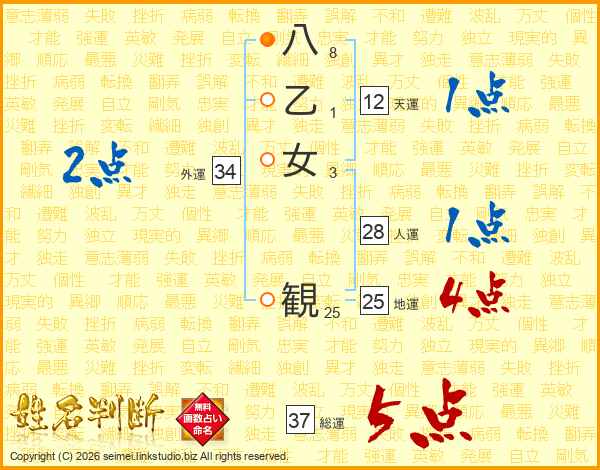 八乙女観さんの総運は37画の5点!