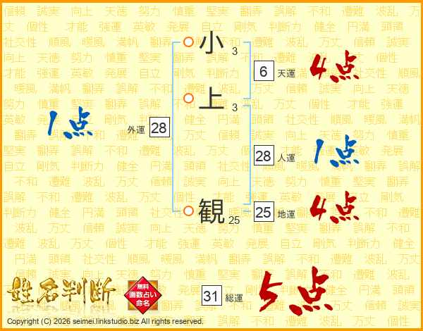 生活面を象徴する運勢です。外部から受ける影響力を表し、結婚運、家庭運や職場、環境への順応性を表します。総運から人運を引いた画数。姓や名が1文字の場合を除く。