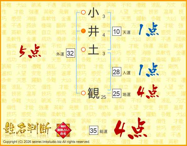 生活面を象徴する運勢です。外部から受ける影響力を表し、結婚運、家庭運や職場、環境への順応性を表します。総運から人運を引いた画数。姓や名が1文字の場合を除く。