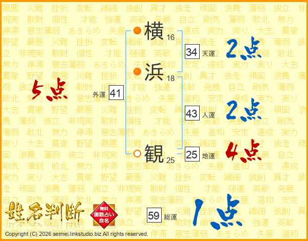 生活面を象徴する運勢です。外部から受ける影響力を表し、結婚運、家庭運や職場、環境への順応性を表します。総運から人運を引いた画数。姓や名が1文字の場合を除く。