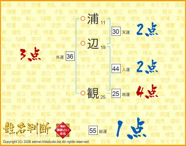 浦(11画)辺(19画) 観(25画)