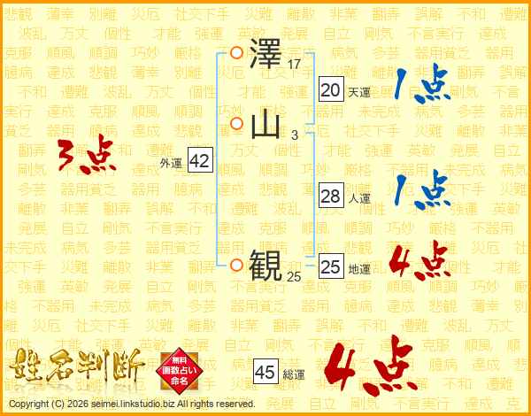 生活面を象徴する運勢です。外部から受ける影響力を表し、結婚運、家庭運や職場、環境への順応性を表します。総運から人運を引いた画数。姓や名が1文字の場合を除く。