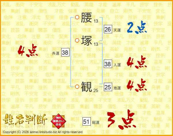 生活面を象徴する運勢です。外部から受ける影響力を表し、結婚運、家庭運や職場、環境への順応性を表します。総運から人運を引いた画数。姓や名が1文字の場合を除く。