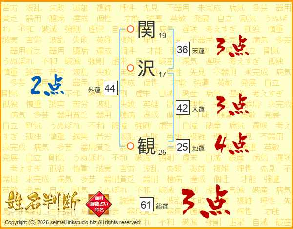 生活面を象徴する運勢です。外部から受ける影響力を表し、結婚運、家庭運や職場、環境への順応性を表します。総運から人運を引いた画数。姓や名が1文字の場合を除く。