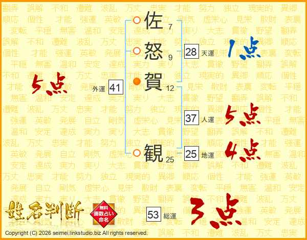 佐怒賀観さんの総運は53画の3点!