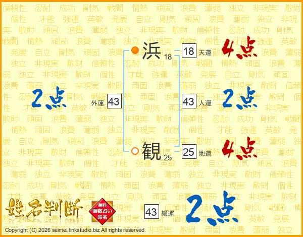 生活面を象徴する運勢です。外部から受ける影響力を表し、結婚運、家庭運や職場、環境への順応性を表します。総運から人運を引いた画数。姓や名が1文字の場合を除く。