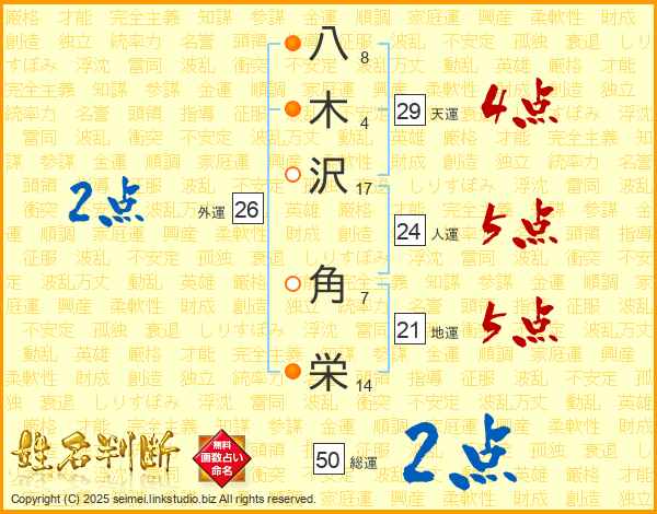 八(8画)木(4画)沢(17画) 角(7画)栄(14画)