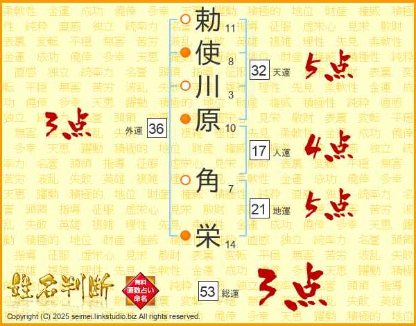 勅(11画)使(8画)川(3画)原(10画) 角(7画)栄(14画)