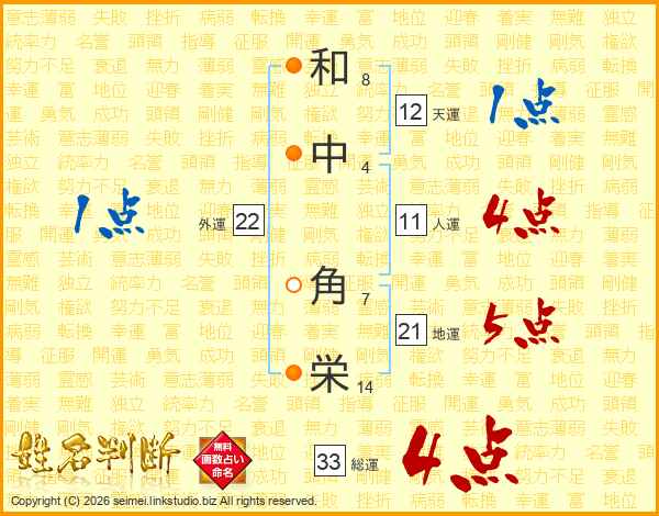 和(8画)中(4画) 角(7画)栄(14画)